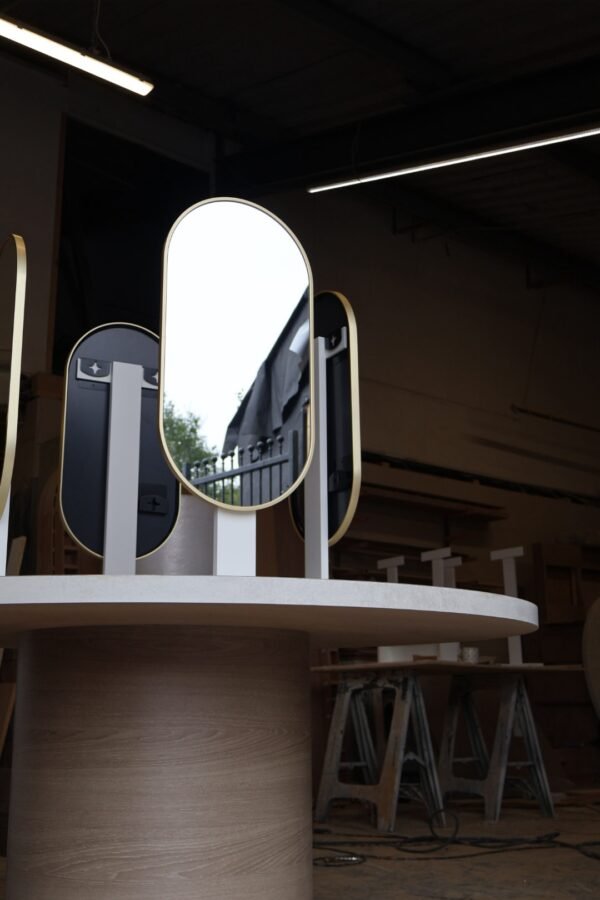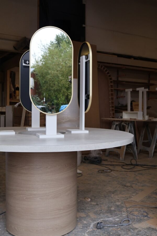 Instantly elevate your salon’s look with our bespoke four station vanity table, expertly designed and crafted in the UK by AUUNIQUE. This premium circular station features four hair stylist mirrors and a distinctive curved finish, blending modern style with exceptional functionality. The unique design adds sophistication to any hair salon, barbershop, beauty parlour, or spa, making your workspace both beautiful and practical.