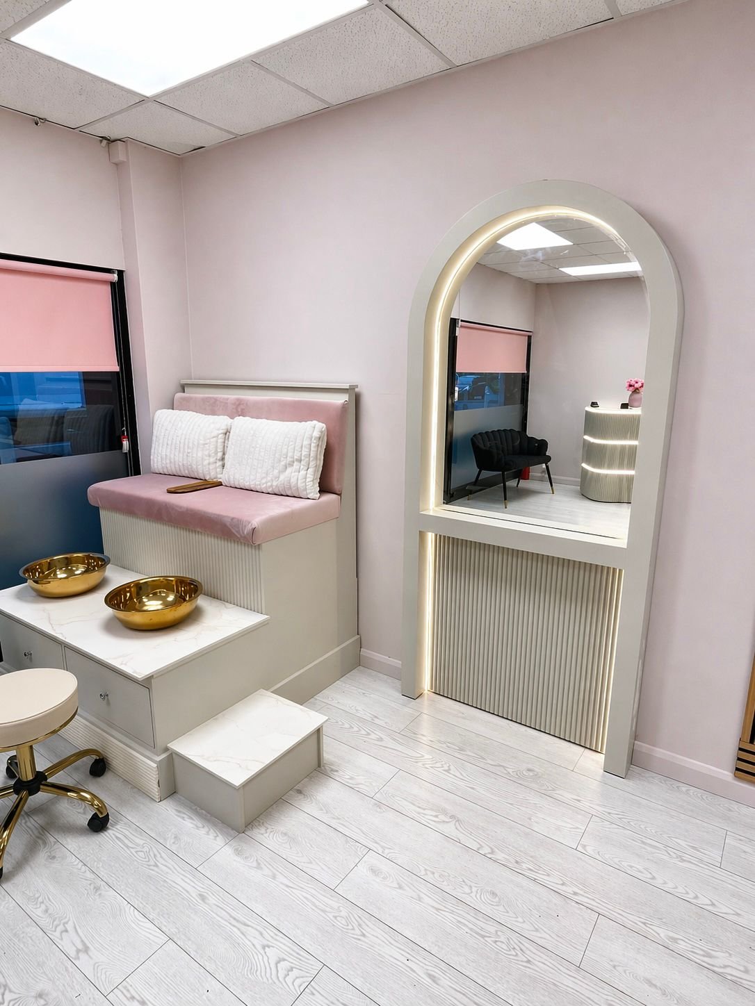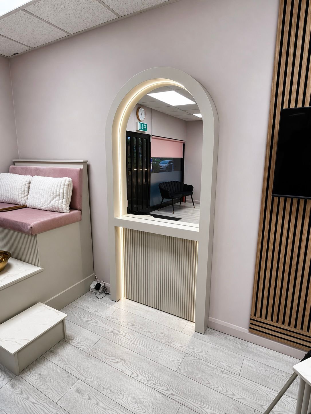 The integrated LED backlighting creates a stunning halo effect, providing professional-grade ambient lighting that enhances every reflection. With a slim 10cm profile, this Curved mirror with reeded base sits neatly against your wall, offering a high-end, bespoke feel. Elevate your brand’s aesthetic and give your clients a premium experience with this unique feature piece.