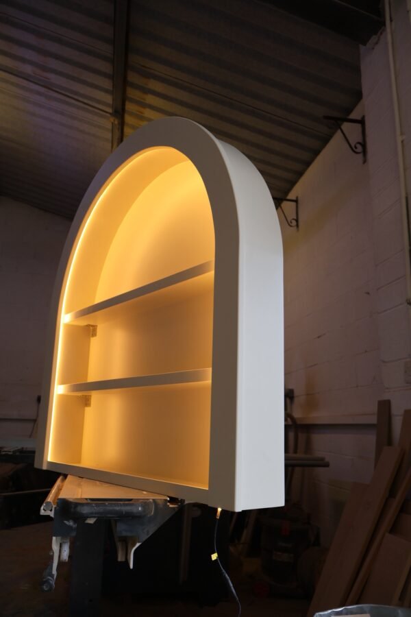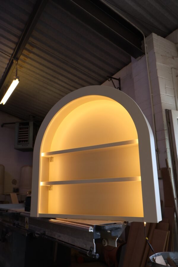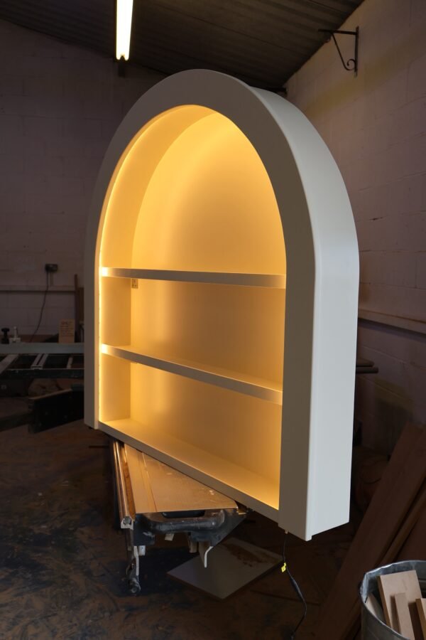 Curved Wall Display with warm LED lighting 2 shelves – Bespoke Salon Showcase Solution