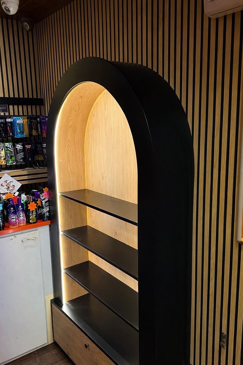 Transform your business interior instantly with our signature Luxury Salon Retail Display: Arched Shelving with Storage. Because this sleek, illuminated showcase blends modern style with practical utility, it creates a distinct focal point that your clients will notice immediately.